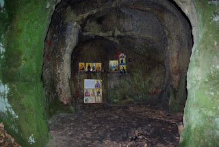 In grota considerata drept un"depozit" de bronzuri, in care se savarseau ritualuri pentru elitele razboinice, unde insasi gravarea armelor putea fi de ordin sacru, acestea fiind considerate totodata si simboluri phallice, nu intarzie sa apara nici reprezentari specifice perioadei ulterioare venirii lui Hristos, cand spatiul pesterii a fost reamenajat si folosit ca schit de mai multe generatii de calugari. Schitul Profiru, din unele surse sau Profirie dupa Emil Lupu, cu hram necunoscut, ar fi functionat aici .